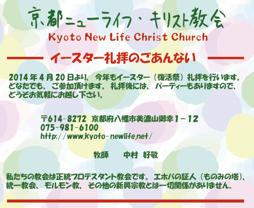 今年もイースター(復活祭)礼拝を行います。どなたでも、ご参加頂けます。礼拝後には、パーティーもありますので、どうぞお気軽にお越し下さい。